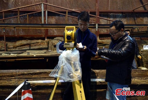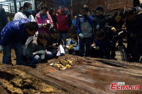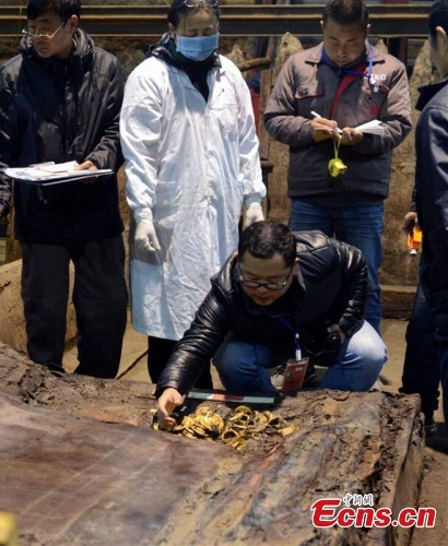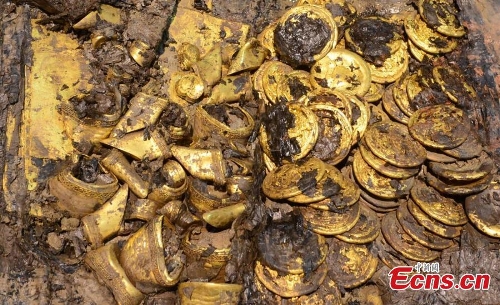 Photo taken on Dec 24, 2015 shows hoof-shaped and round gold ware unearthed from the outer coffin in the Haihunhou (Marquis of Haihun) cemetery, East China's Jiangxi province. Chinese archaeologists have found more than 20,000 pieces of relics from a 2,000-year-old tomb, which they believe belong to a marquis of the Western Han Dynasty (206 BC - 24 AD). Now they have entered the final and key phrase. (Photo: China News Service/Guo Jing)