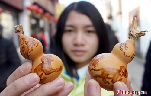 Gourd phrography is a traditional Chinese handicraft. As the Year of the Monkey comes, handicrafts related with the zodiac monkeys have become particularly popular throughout the country. Wang Lanqi, a gourd pyrography artist in Suzhou, Jiangsu province, has recently created a group of zodiac monkey handicrafts using the high-temperature electric ironing. His works have a distinctive style and are well received by both local people and tourists.