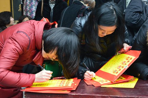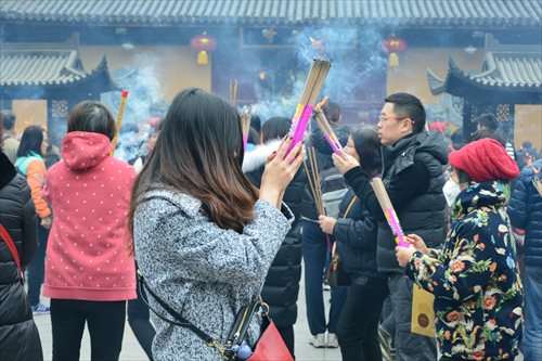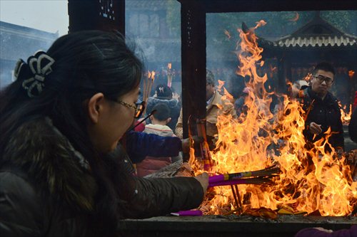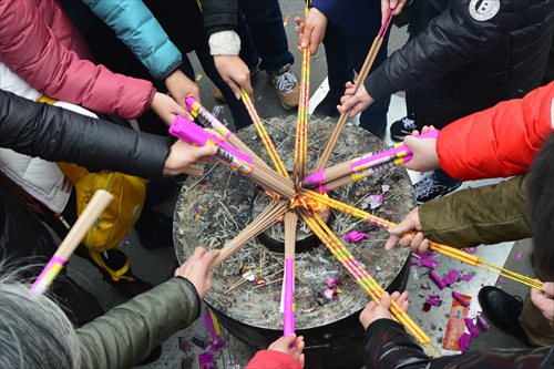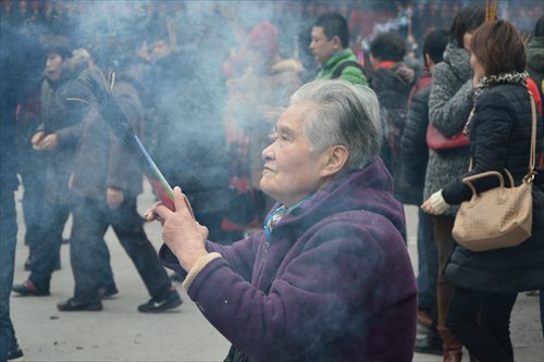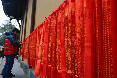 Visitors at the Longhua Temple on Sunday lit incense, knelt on the ground or bowed their heads as they prayed for good fortune. Some wrote their wishes for the coming new year on strips of red cloth and attached them to special areas in the temple. It's a prelude to the grand Chinese New Year prayer ceremony which happens in the last days of the last lunar month and the beginning of the new year, when even more visitors are expected.
