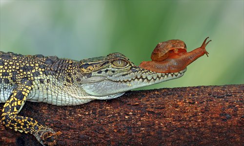 A brave snail crawls over the top of a crocodile's snout at the Tanjung Pasir Crocodile Park, Indonesia, media reported Saturday. It was taken by Indonesian graphic designer Kurit Afshee. Photo: IC