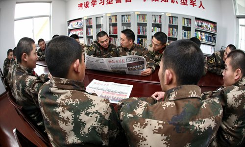 Soldiers of the Chinese People's Armed Police Force in Yangzhou, Jiangsu Province study the PLA Daily on Thursday. Photo: IC