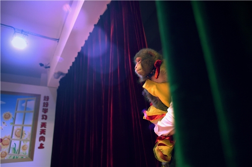 A monkey peeks out from behind a curtain during a rehearsal at a monkey training school in a zoo in Dongying, Eastern China's Shandong province. (Source: Chinadaily.com.cn)