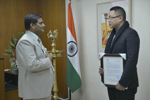 Indian Consul General Prakash Gupta speaks with the son of Wang Zhijie.