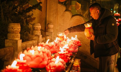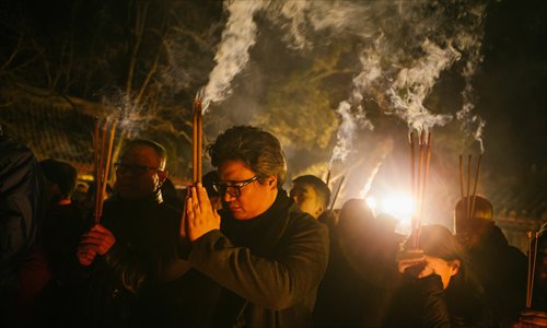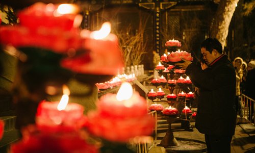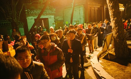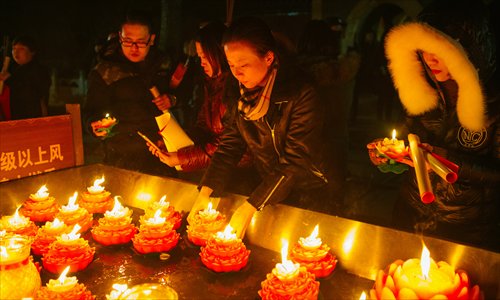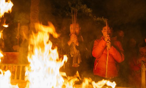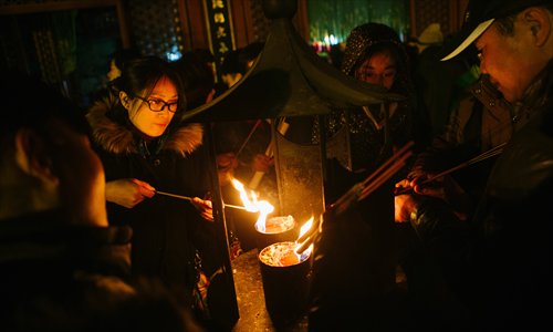 Locals burn incense and light candles at the Beijing's Tanzhe Temple in the early morning of February 8, 2016, the first day of the new year according to the Chinese traditional lunar calendar. Incense offering in temples during Spring Festival is a tradition in China to pray for good luck. More than 10,000 people have offered incense in the early morning at the Tanzhe Temple. Photo: Li Hao/GT