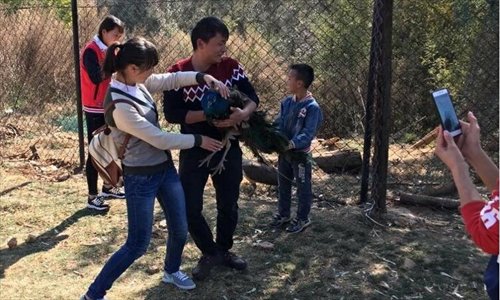 Tourists grab a peacock that later died from stress at the Yunnan Wild Animal Park in Kunming on February 12. Photo: IC