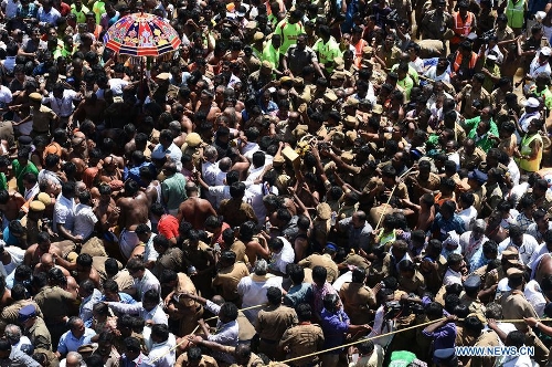 Thousands of people gather to take a dip on the occasion of the Mahamaham Festival 2016 at the Mahamaham tank in Kumbakonam, southeast Indian state of Tamil Nadu, India, on Feb. 22, 2016. More than 2.75 lakh pilgrims took a dip in the famed tank since midnight on Monday, said local media. Hindus consider this activity on the day of Mahamaham, a Hindu festival celebrated every 12 years, as sacred. (Xinhua/Stringer)