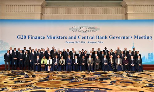 Officials pose for a family photo at the G20 Finance Ministers and Central Bank Governors Meeting at the Pudong Shangri-la Hotel in Shanghai, east China, February 27, 2016. Chinese policymakers on Friday sketched out the country's economic policies and reform agenda, reassuring the world that the government has plenty policy tools to combat downward pressure as financial leaders from G20 nations gathered in Shanghai. Photo: Xinhua
