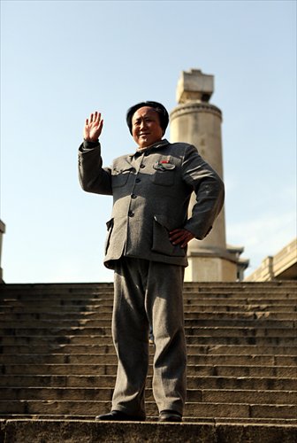 Mao Zedong impersonator Xia Yuhua, clad in a Mao suit and sporting the late leader's signature hairstyle, attracts the attention of passersby wherever he goes.