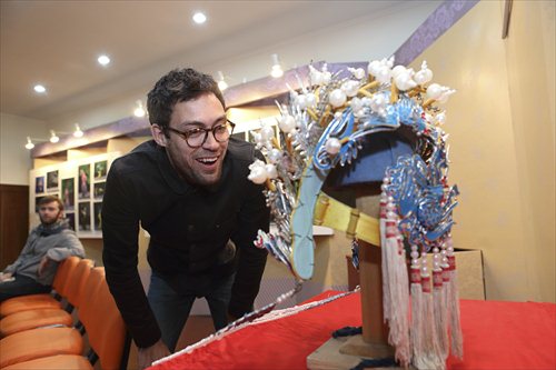 Alex Hassell, a British actor from the Royal Shakespeare Company looks at a traditional Chinese headdress while on a visit to the Shanghai Kunqu Opera Troupe. Read the Global Times' coverage of the 400th anniversary of the death of William Shakespeare and Chinese theater genius Tang Xianzu. Photo: Courtesy of the Shanghai Grand Theatre