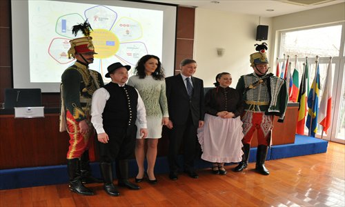 The EU Ambassador to China Hans Dietmar Schweisgut (fourth from left) and the Hungarian Ambassador to China Cecilia Szilas (third from left) take a group photo with Hungarian Hussars and dancers at the launch of EUNIC EUROPE. Photo: Yin Yeping/GT