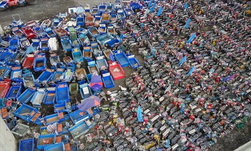 Rows of seized vehicles stand in a parking lot in Shenzhen, Guangdong Province on Tuesday. A total of 17,975 vehicles had been seized and 874 drivers detained as of March 31, after police began a new campaign to ban unregistered or illegally piloted motorcycles and motorized tricycles. Photo: CFP
