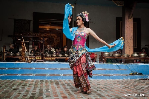 An Indonesian maestro performs traditional dance Didik Nini Thowok using an ancient gamelan at Lawang Ombo house in the Small China at Lasem, Center Java province, Indonesia, April 5, 2016. Lasem is a small town on the north coast of Java island, located exactly in Rembang regency, Central Java Province in Indonesia. The City has a long history of Javanese-Chinese culture that was dubbed as Small China. (Xinhua/Veri Sanovri)