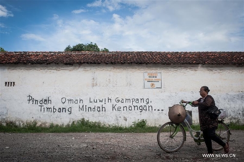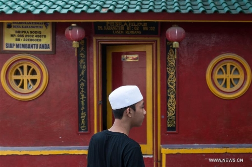 A boarding student passes in front of the security guard post building that decorated with ethnic Chinese and Moslem calligraphy in the Small China at Lasem, Center Java province, Indonesia, April 5, 2016. Lasem is a small town on the north coast of Java island, located exactly in Rembang regency, Central Java Province in Indonesia. The City has a long history of Javanese-Chinese culture that was dubbed as Small China. (Xinhua/Veri Sanovri)