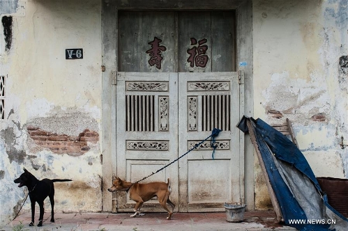 Photo taken on April 5, 2016 shows two dogs are tied up at the door in front of a house in the Small China at Lasem, Center Java province, Indonesia. Lasem is a small town on the north coast of Java island, located exactly in Rembang regency, Central Java Province in Indonesia. The City has a long history of Javanese-Chinese culture that was dubbed as Small China. (Xinhua/Veri Sanovri)