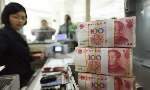 A bank staff member checks RMB banknotes at a bank in Lianyungang, east China's Jiangsu Province, January 7, 2016. Photo: Xinhua
