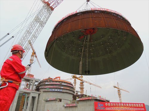Workers put a dome in place at the Tianwan Nuclear Power Plant in Lianyungang, Jiangsu Province, on September 26, 2015. Photo: CFP