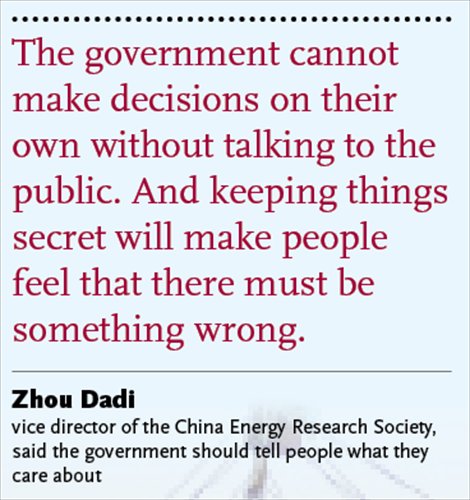 "The government cannot make decisions on their own without talking to the public. And keeping things secret will make people feel that there must be something wrong," Zhou said, noting that in the Japanese nuclear plants he has been to, they build a club by the plant and invite children to tour the premises. They can learn about nuclear power and get a look at the whole environment. "Seeing is believing," he stressed.