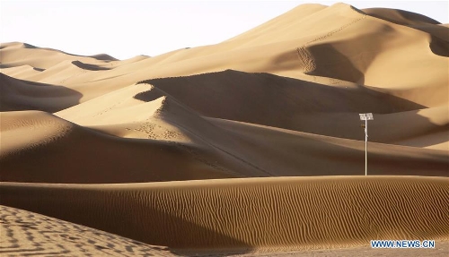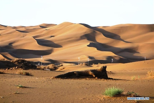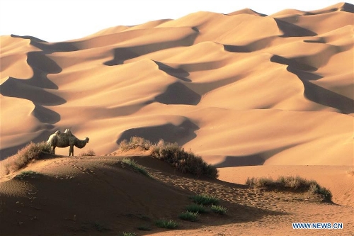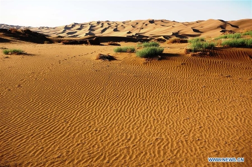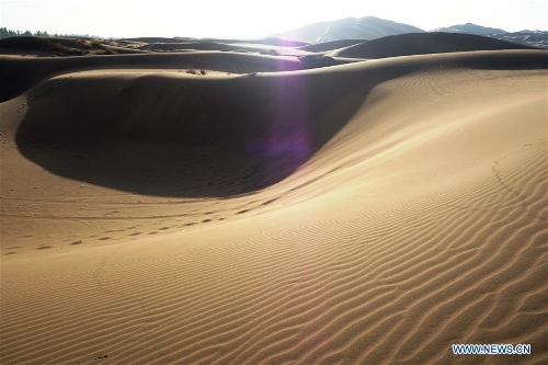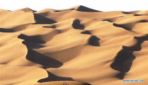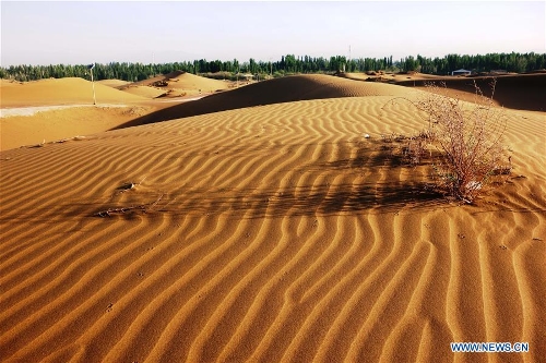 Photo taken on April 29, 2016 shows the Kum Tag Desert in Shanshan County, northwest China's Xinjiang Uygur Autonomous Region. The Kum Tag Desert, which covers an area of 2,500 square kilometers, is the nearest desert to a city in the world as it is only one kilometer away from the town of Shanshan. (Xinhua/Jiang Xiaoming)
