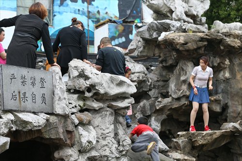 Some tourists climb up the rockery at Qibao Old Street while ignoring a sign prohibiting people from climbing. Uncivilized behavior by tourists reappeared in Shanghai over the recent May Day holiday, which included throwing trash on the ground at tourist attractions and ignoring rules and warnings. Photo: CFP