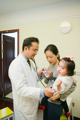 Yang Ming, the deputy director of the pediatric department at Beijing United Family Hospital, gives a checkup to one-and-a-half-year-old Meredith who is held by her mother, Kathy Wang. Photo: Li Hao/GT