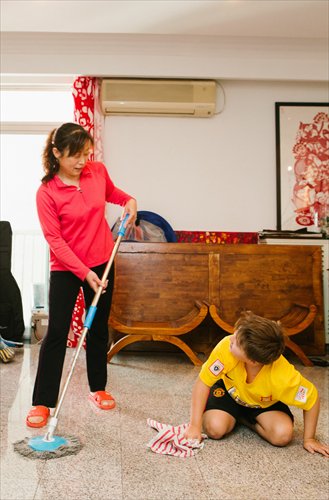 Meng Junman (left) cleans the house of the expat family she works for, as their younger son Ty plays. Photo: Li Hao/GT