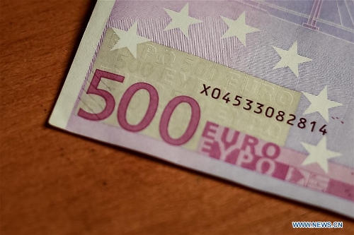 Photo taken on May 4, 2016 shows a 500 euro banknote in Berlin, Germany. The European Central Bank(ECB) announced on Wednesday it would stop printing and distributing the 500 euro banknote around the end of 2018. (Xinhua/Zhang Fan)