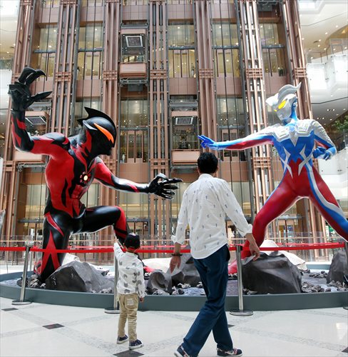 A father and son admire models of Ultraman at a shopping center in Huangpu district. To celebrate the 50th anniversary of the Ultraman series, an exhibition is being held through June 5. It is the first time that these 5-meter-high Ultraman models have been displayed in Shanghai, along with over 300 related exhibits. Photo: Yang Hui/GT