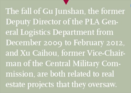 Among the nearly 50 "tigers" who were cracked down in China's fight against corruption in the military, many are from the general logistics department or in charge of the approval of real estate-related projects. The fall of Gu Junshan, the former Deputy Director of the PLA General Logistics Department from December 2009 to February 2012, and Xu Caihou, former Vice-Chairman of the Central Military Commission, are both related to real estate projects that they oversaw.