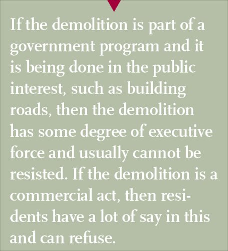 If the demolition is part of a government program and it is being done in the public interest, such as building roads, then the demolition has some degree of executive force and usually cannot be resisted, so the residents should ask for appropriate compensation. If the demolition is a commercial act, then residents have a lot of say in this and can refuse.
