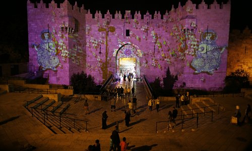 People watch an audiovisual light show projected over the ancient walls of Jerusalem's Damascus Gate in the old city during the Festival of Lights on Wednesday. According to the event's website, each year the festival brings 250,000 visitors to the old city. The Festival of Lights will last until June 2. Photo: AFP