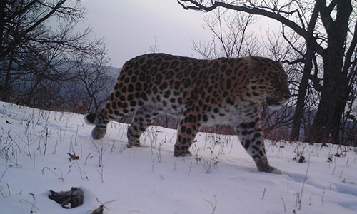 An image taken by an infrared camera on November 29, 2015 shows an Amur leopard in Laoyeling nature reserve of Heilongjiang province. Siberian tigers have been photographed four times and Amur leopards nine times by the camera, Heilongjiang provincial forestry department said on Thursday. (Photo provided by Heilongjiang provincial forestry department)