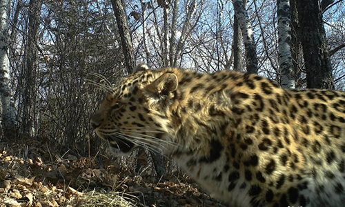 An image taken by an infrared camera on April 5, 2016 shows an Amur leopard in Laoyeling nature reserve of Heilongjiang province. Siberian tigers have been photographed four times and Amur leopards nine times by the camera, Heilongjiang provincial forestry department said on Thursday. (Photo provided by Heilongjiang provincial forestry department)