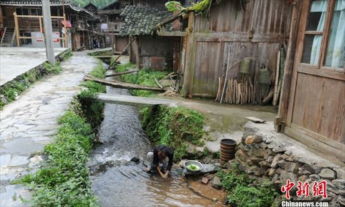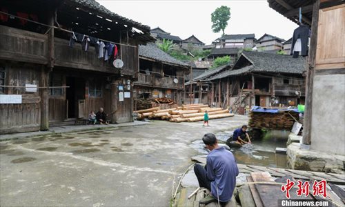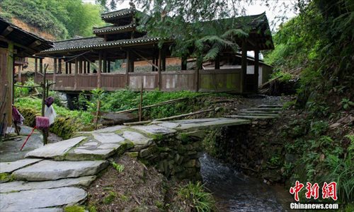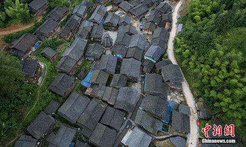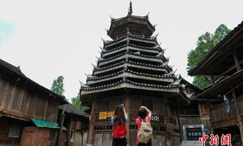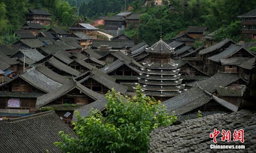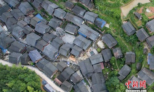 Photo taken on May 31 shows the unique traditional buildings of the Dong people in Zaidang village in Rongjiang county, southwest China's Guizhou province. (Photo/CNS)