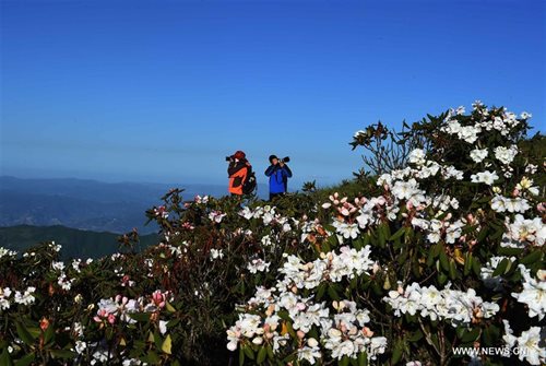 Tourists take picture of alpine azaleas on Dapingzi peak of Wumeng Mountain in Zhaoyang District of Zhaotong, southwest China's Yunnan Province, June 3, 2016. (Xinhua/Yang Zongyou)