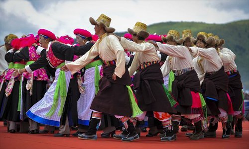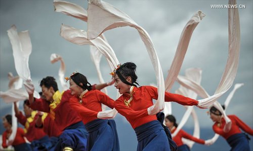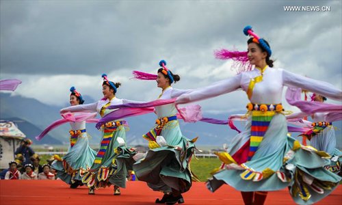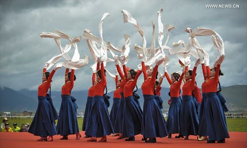 People perform Tibetan dance for spectators at a horse race festival in Shangri-la, Tibetan Autonomous Prefecture of Diqing in southwest China's Yunnan Province, June 9, 2016. A total of 194 horses participated in a three-day ethnic traditional horse race festival that kicked off in Shangri-la on Thursday. (Xinhua/Zhou Lei)