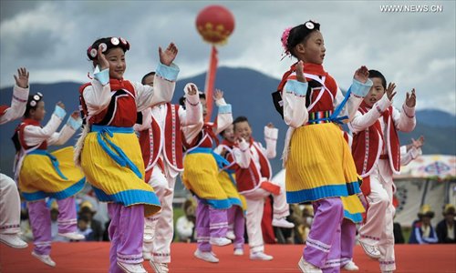 Local pupils dance for spectators at a horse race festival in Shangri-la, Tibetan Autonomous Prefecture of Diqing in southwest China's Yunnan Province, June 9, 2016. A total of 194 horses participated in a three-day ethnic traditional horse race festival that kicked off in Shangri-la on Thursday. (Xinhua/Zhou Lei)