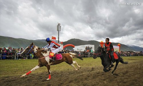 Riders perform for spectators at a horse race festival in Shangri-la, Tibetan Autonomous Prefecture of Diqing in southwest China's Yunnan Province, June 9, 2016. A total of 194 horses participated in a three-day ethnic traditional horse race festival that kicked off in Shangri-la on Thursday. (Xinhua/Zhou Lei)