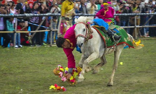 A rider performs for spectators at a horse race festival in Shangri-la, Tibetan Autonomous Prefecture of Diqing in southwest China's Yunnan Province, June 9, 2016. A total of 194 horses participated in a three-day ethnic traditional horse race festival that kicked off in Shangri-la on Thursday. (Xinhua/Zhou Lei)