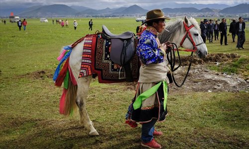 A man waits for a horse race festival in Shangri-la, Tibetan Autonomous Prefecture of Diqing in southwest China's Yunnan Province, June 9, 2016. A total of 194 horses participated in a three-day ethnic traditional horse race festival that kicked off in Shangri-la on Thursday. (Xinhua/Zhou Lei)