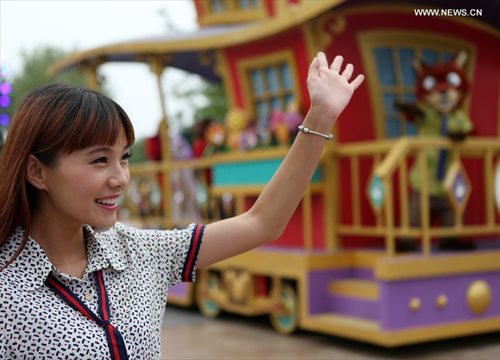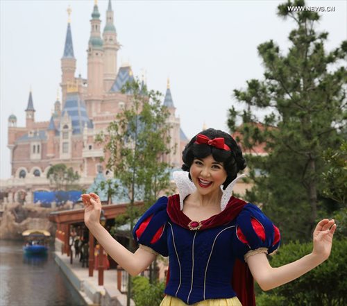 A staff member imitating Snow White of Disney classic cartoon characters greets tourists at Shanghai Disneyland in Shanghai, east China, June 15, 2016. The Shanghai Disney Resort is to open on June 16. (Xinhua/Pei Xin)