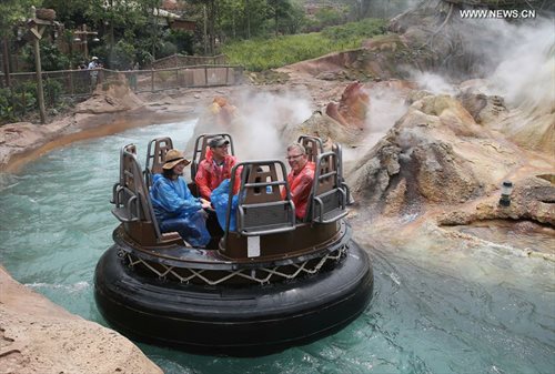 Tourists invited to attend the opening ceremony experience "Roaring Rapid" at Shanghai Disneyland in Shanghai, east China, June 15, 2016. The Shanghai Disney Resort is to open on June 16. (Xinhua/Pei Xin)