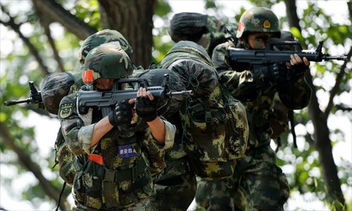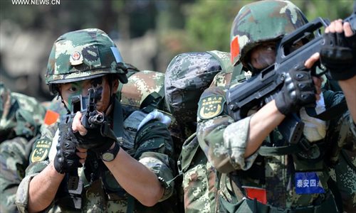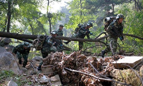 Chinese People's Armed Police Force soldiers take part in a searching session at the Mountain Tai in Taian, east China's Shandong Province, June 16, 2016. Soldiers of the Armed Police Force in Shandong held training sessions in the forest at the Mountain Tai on Thursday. The training will last for 7 days and nights, including 43 sessions of 6 categories. (Xinhua/Zhu Zheng)