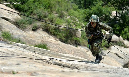 A Chinese People's Armed Police Force soldier takes part in a climbing session at the Mountain Tai in Taian, east China's Shandong Province, June 16, 2016. Soldiers of the Armed Police Force in Shandong held training sessions in the forest at the Mountain Tai on Thursday. The training will last for 7 days and nights, including 43 sessions of 6 categories. (Xinhua/Zhu Zheng)