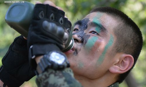 A Chinese People's Armed Police Force soldier drinks water during a training at the Mountain Tai in Taian, east China's Shandong Province, June 16, 2016. Soldiers of the Armed Police Force in Shandong held training sessions in the forest at the Mountain Tai on Thursday. The training will last for 7 days and nights, including 43 sessions of 6 categories. (Xinhua/Zhu Zheng)