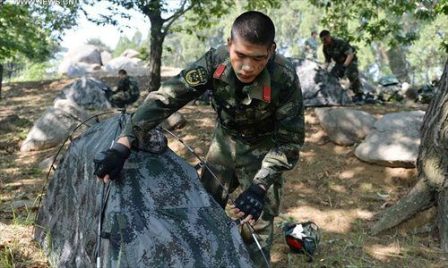 Chinese People's Armed Police Force soldiers set up tents during a training at the Mountain Tai in Taian, east China's Shandong Province, June 16, 2016. Soldiers of the Armed Police Force in Shandong held training sessions in the forest at the Mountain Tai on Thursday. The training will last for 7 days and nights, including 43 sessions of 6 categories. (Xinhua/Zhu Zheng)