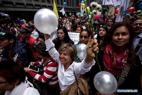 Residents gather during the broadcast of the signing ceremony of the ceasefire agreement between the Colombian government and the FARC guerrilla group in Havana, in Bogota, capital of Colombia, on June 23, 2016. The Colombian government and FARC guerrilla group on Thursday signed a historic ceasefire deal, bringing the country's half-century civil war closer to a definitive end. (Xinhua/Jhon Paz)