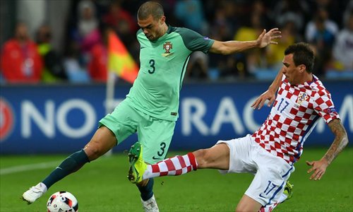 Pepe (L) of Portugal vies with Mario Mandzukic of Croatia during the Euro 2016 round of 16 soccer match between Portugal and Croatia in Lens, France, on June 25, 2016. Photo: Xinhua