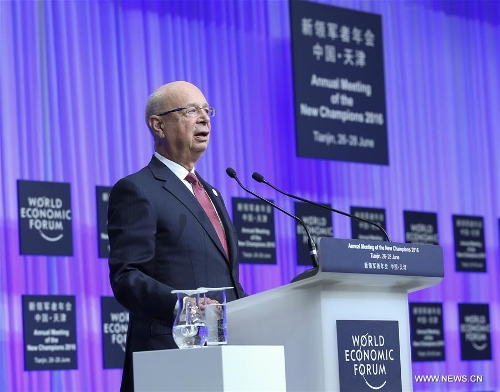 Klaus Schwab, World Economic Forum (WEF) founder and executive chair, speaks at the opening ceremony of the Annual Meeting of the New Champions 2016, or Summer Davos Forum, in Tianjin, north China, June 27, 2016. (Xinhua/Pang Xinglei)