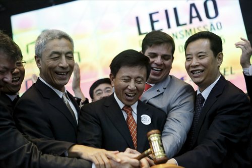 State Grid Corporation of China executives pound a gavel to signal the close of trading at Brazil's BM&FBOVESPA stock market in Sao Paolo in July 2015. The company won the bid to build a second power transmission line in Brazil. Photo: CFP