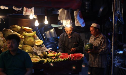 A Muslim man buys fruits before sunrise at Limin Alley, Urumqi, during the Ramadan fast, which started on June 6, 2016.Photo:Cui Meng/GT